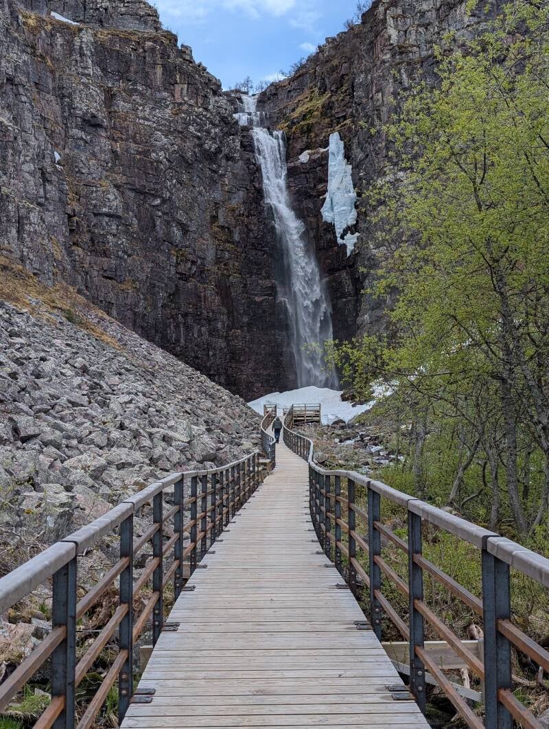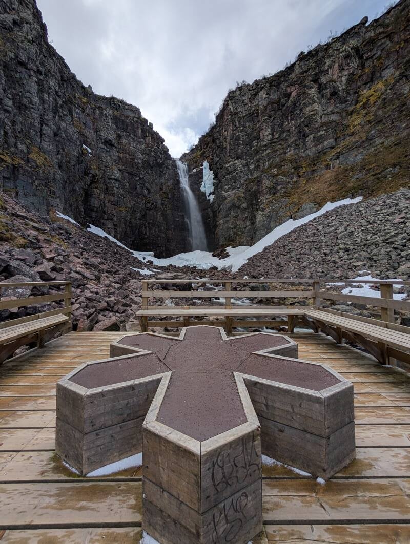 Der Njupeskär ist mit 125 Meter Höhe, davon 90 Meter in freiem Fall der höchste Wasserfall Schwedens. Er liegt in der Provinz Dalarna die wir schon von unserem Besuch bei den Dalarna-Pferde Schnitzer kennen.