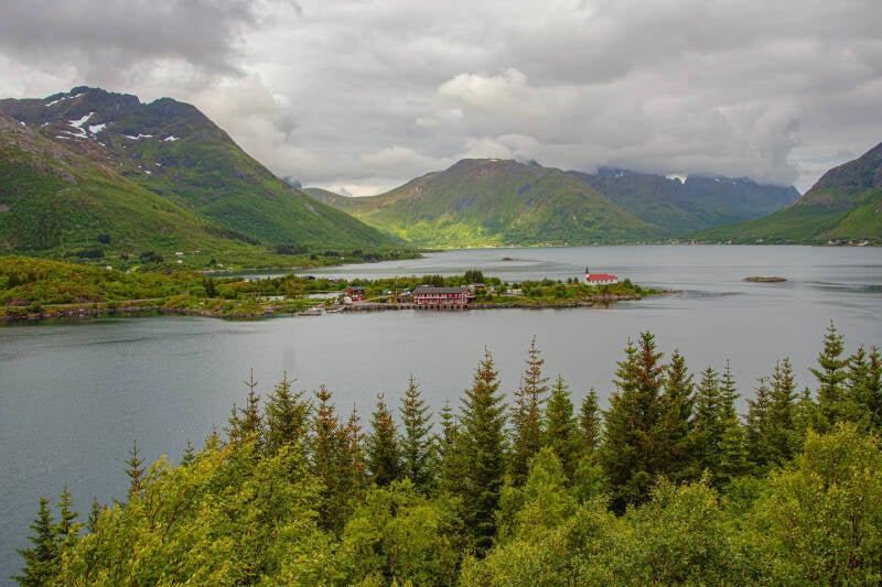 Entlang der einzigartigen Landschaft der Lofoten mit seinen wunderschönen Bergmassiven gelangen wir zum Nusfjord.