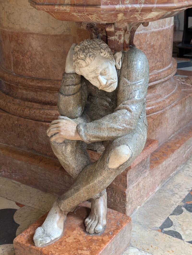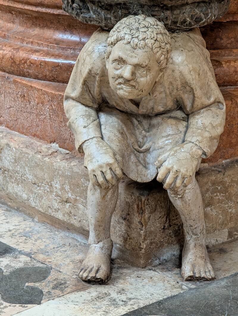 Direkt am Eingang stehen die Weihwasserbecken die von zwei Skulpturen " I Gobbi " die Buckligen getragen werden. Man sagt, dass das Berühren der Buckel Glück bringen soll. ;0))