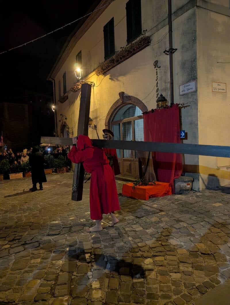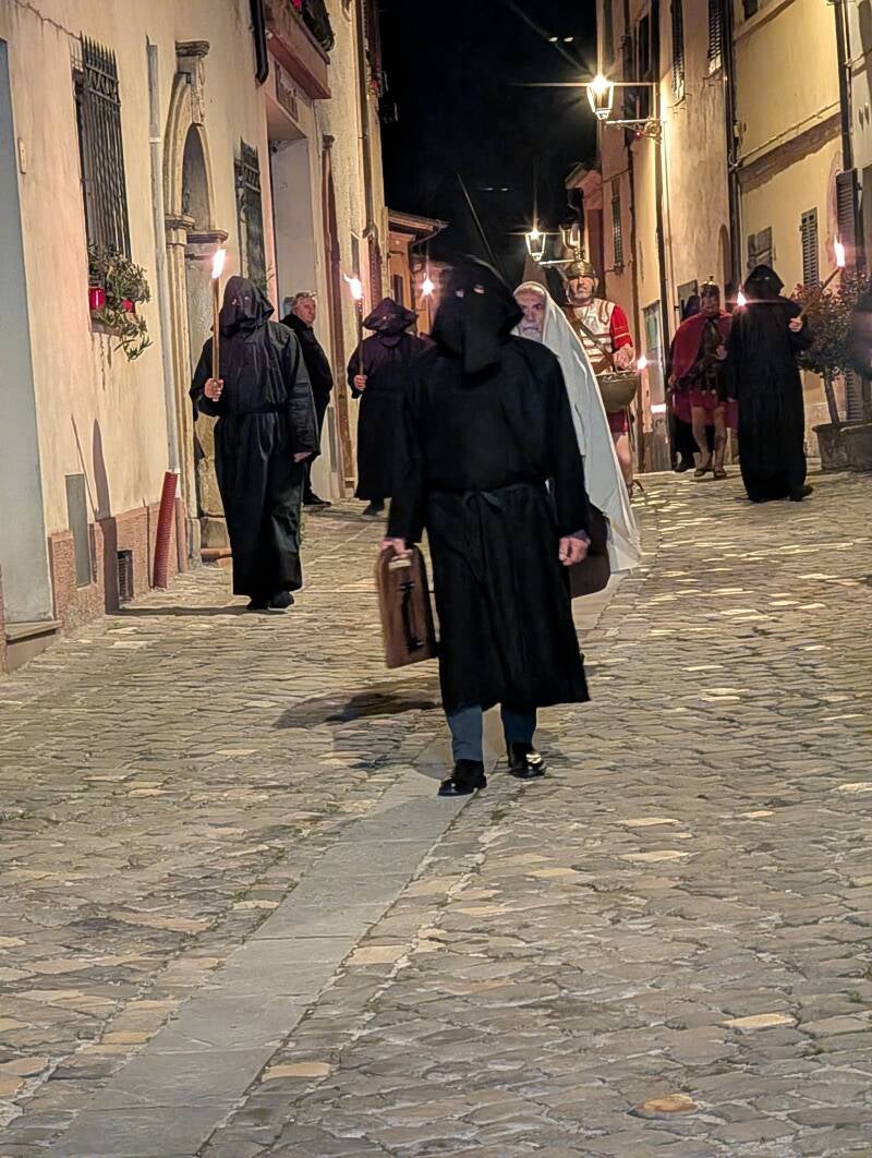 Am Karfreitag erleben wir unsere erste Prozession, die als nächtlicher Umzug durch die mittelalterlichen Gassen des Dorfes führt, und den Abstieg vom Kalvarienberg sowie die anschließende Grablegung inszeniert.