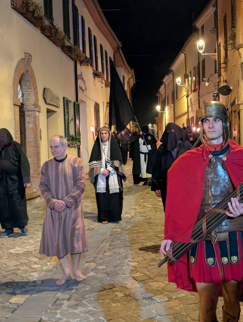 Über 100 Teilnehmer (alles Dorfbewohner ) , darunter römische Soldaten, Kapuzenträger und Engel bevölkern den Zug. Im Zentrum des Zuges wird die Statue des toten Christus auf einer Bahre getragen, begleitet von den Klängen von Trommeln und Trompeten.